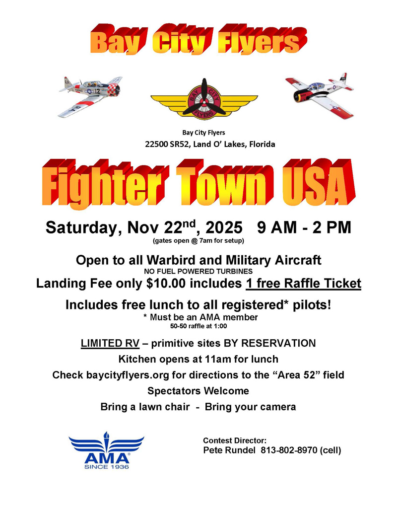 Bay City Flyers (BCF) is a non-profit radio control (RC) flying club. BCF is chartered by the ACADEMY OF MODEL AERONAUTICS (AMA, www.modelaircraft.org), the world’s largest sport aviation organization, and is recognized by AMA as a Gold level Leader Club.